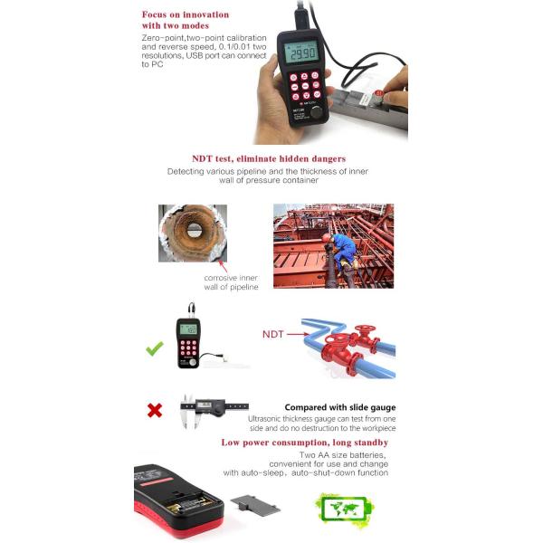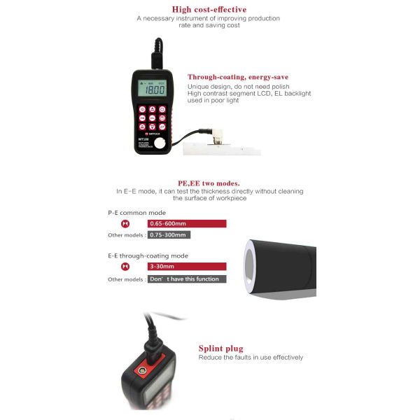 Miteh MT180 multi-mode ultrasonic thickness gauge, based on ultrasonic measuring principle, it can perform thickness measurements on a wide range of materials including metals, plastic, ceramics glass and other ultrasonic well-conductive materials. It is also capable for measuring the sound velocity of the object with known thickness. Compared with the traditional measurement method, the advantage of ultrasonic thickness gauge is that it can finish the measurement only if it contacts with one side of the measured workpiece. Its unique performance of capable for testing thickness through the coating provides efficient solution for testing the workpiece of coated surface or corrosion materials. It can test the workpiece directly without needing to get rid of the surface coating.